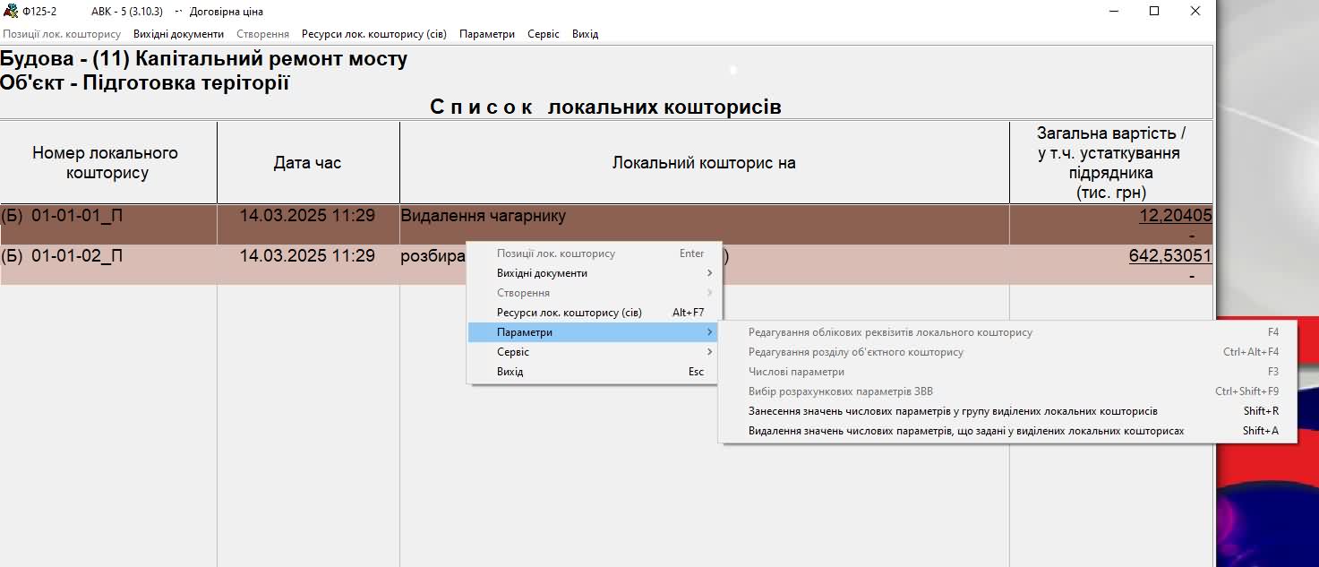 Для цього у параметрах об’єкта та локального кошторису додано відповідні пункти меню:
