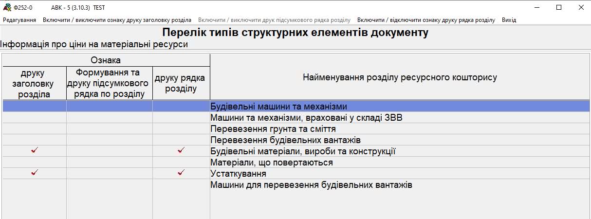 За замовчуванням ці рядки не актуалізовані. У разі необхідності відображення в документі інформації про устаткування слід установити ознаку актуалізації для цих рядків: